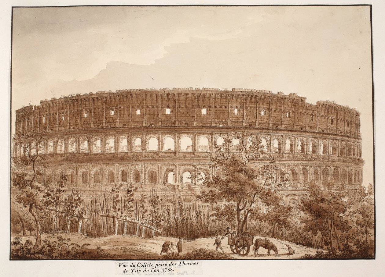 Vista do Coliseu dos Banhos de Tito, no ano de 1788, 1833 (gravura com lavagem marrom)(View of the Colosseum from the Baths of Titus, in the year 1788, 1833 (etching with brown wash))Agostino Tofanelli |