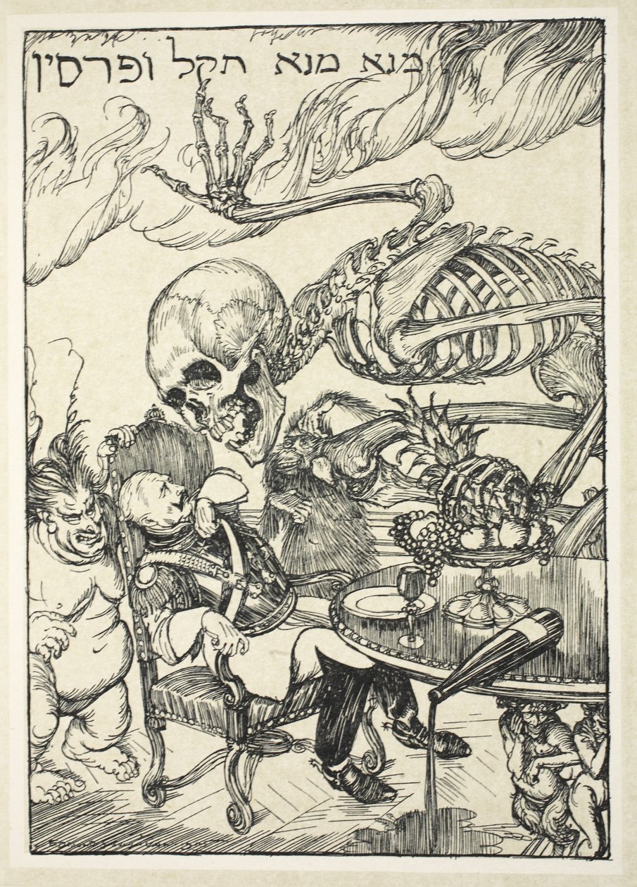 A escrita na parede, ilustração da festão do Kaiser por Edmund J. Sullivan, bar. 1916(The writing on the wall, illustration from The Kaiser's Garland by Edmund J. Sullivan, pub. 1916 )Edmund Joseph Sullivan |