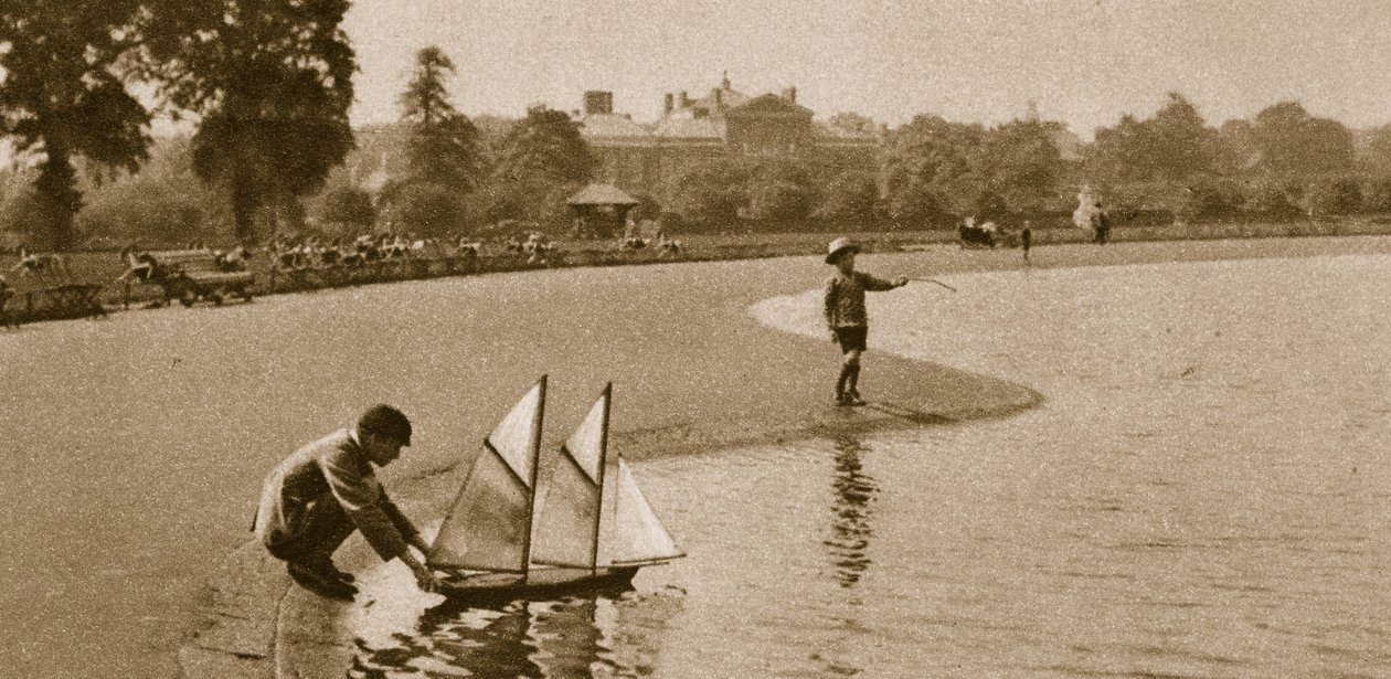 Crianças barcos modelo de corrida na lagoa redonda, Kensington Gardens, 1926 (foto sépia)(Children racing model boats on the Round Pond, Kensington Gardens, 1926 (sepia photo))English Photographer |