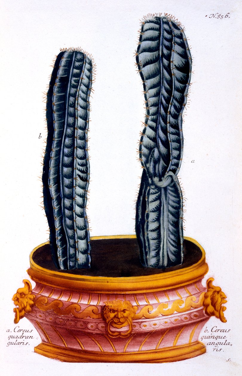 Cereus quadrangularis e Cereus quinque angularis, de &39;Phytanthoza Iconographia&39;, de Johann Wilhelm Weinmann, publicado em c.1737-45 (mezzotint)(Cereus quadrangularis and Cereus quinque angularis, from 'Phytanthoza Iconographia', by Johann Wilhelm Weinmann, published c.1737-45 (mezzotint))Georg Dionysius Ehret |