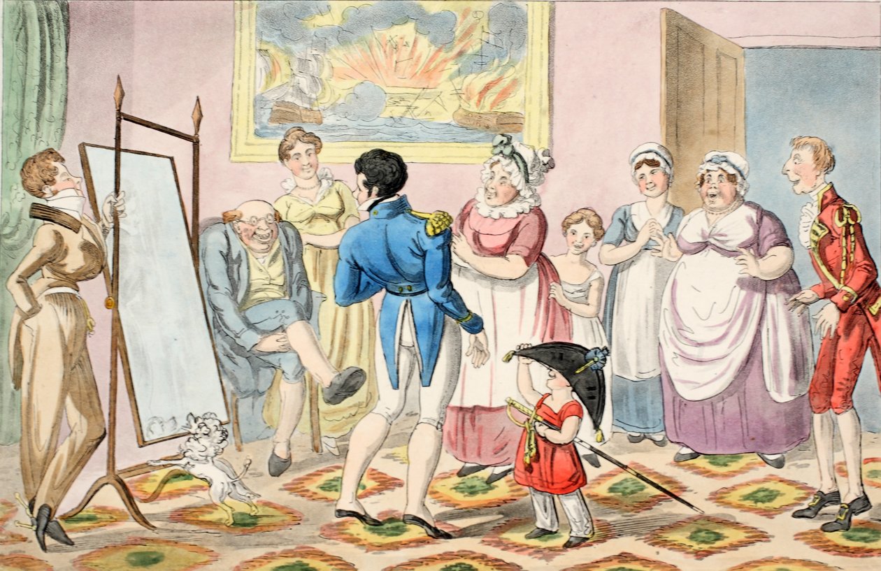 O sr. B promoveu ao tenente e, primeiro, vestiu seu uniforme, de The Progress of a Midshipman, pub. 1835 (gravura colorida à mão)(Mr. B promoted to Lieutenant, and first putting on his uniform, from The Progress of a Midshipman, pub. 1835 (hand coloured engraving))George Cruikshank |
