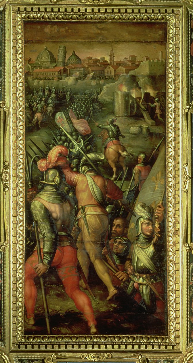 A Batalha de Barbagianni do teto do Salone dei Cinquecento, 1565 (painel)(The Battle of Barbagianni from the ceiling of the Salone dei Cinquecento, 1565 (panel))Giorgio Vasari |