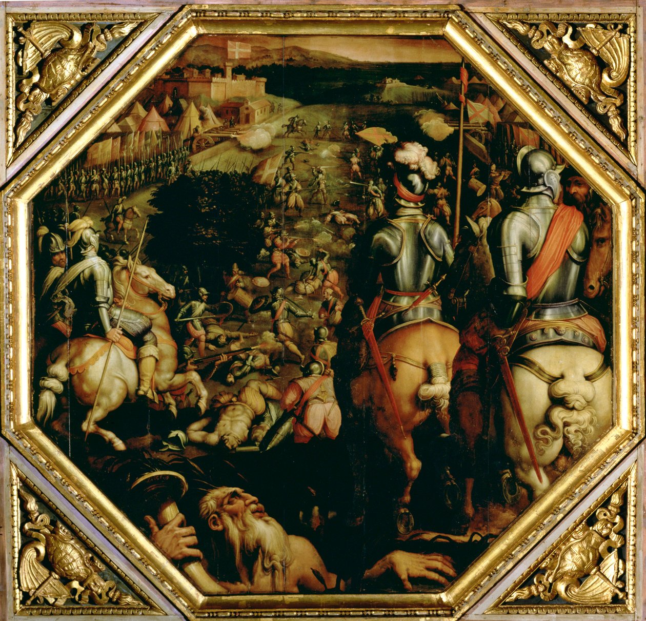 A Batalha de Marciano em 1553, a partir do teto do Salone dei Cinquecento, 1565 (painel)(The Battle of Marciano in 1553, from the ceiling of the Salone dei Cinquecento, 1565 (panel))Giorgio Vasari |