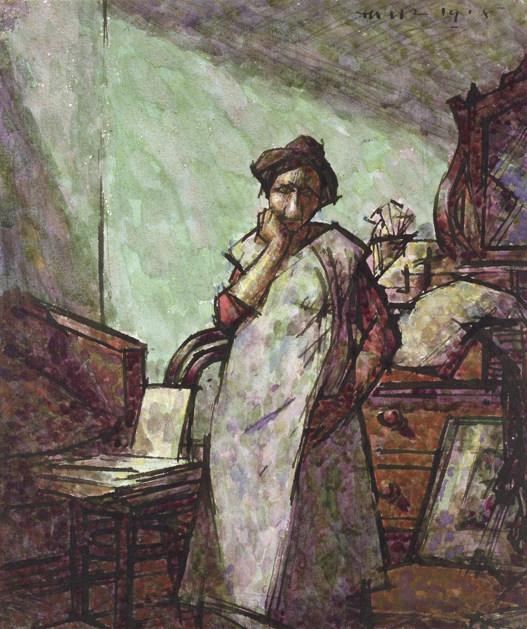 Interior com a Sra. Mounter em uma geral, 1 de dezembro de 1918 (caneta e tinta preta e aquarela)(Interior with Mrs Mounter in an Overall, 1 December 1918 (pen and black ink and watercolour))Harold Gilman |
