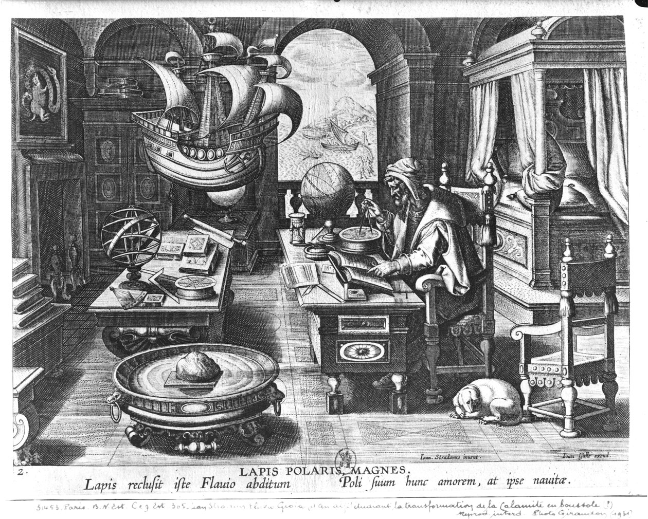 Flavio Gioia de Amalfi descobrindo o poder do Lodestone, prato 3 de "Nova Reperta" (novas descobertas) gravada por Philip Galle (1537-1612) c.1600(Flavio Gioia of Amalfi discovering the Power of the Lodestone, plate 3 from 'Nova Reperta' (New Discoveries) engraved by Philip Galle (1537-1612) c.1600 )Jan van der Straet |