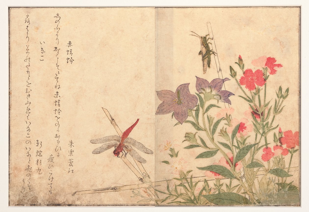 Libélula vermelha e gafanhoto de arroz, 1788 (xilogravura)(Red dragonfly and rice locust, 1788 (woodblock))Kitagawa Utamaro |