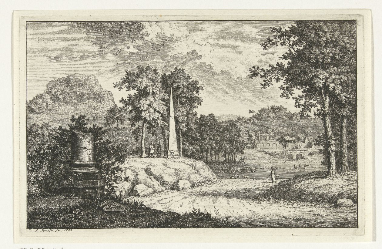 Paisagem montanhosa com obelisco à beira da estrada(Heuvelachtig landschap met obelisk langs de weg)Leendert Brasser(print maker) |