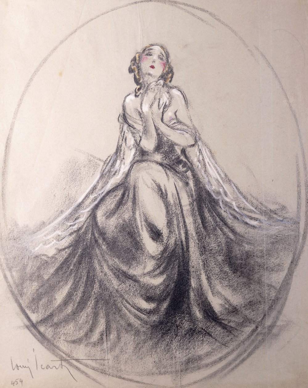 Uma senhora sentada em pose teatral(A Seated Lady in Theatrical Pose)Louis Icart |