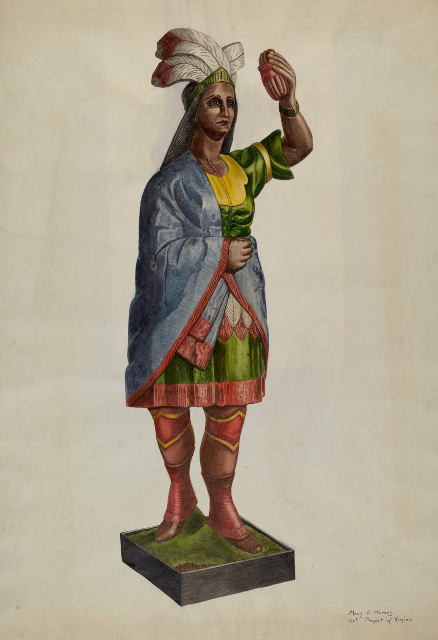 azul · fim acima · wooden indian · amonute · mary e humes · humes · mary e · fêmea · mulheres · mulher · povos · shopping · loja · lojas · artes · país · local · estátua · estátuas · arte · verde · roupa · colorido · washington · vestido · nativo · americano nativo · propaganda · anunciar · posição · século · desenho · galeria · advert · statuette · gesticular · roupa · thirties · figurine · close-up · indian americano · gesto da mão · braço levantado · anúncio · watercolour · galeria de arte · casaco · tunic · estados unidos de ameri · 1930s · galeria nacional da arte · 20o século · loja do charuto · indian da loja do charuto · tobacconist · americano · américa · pocahontas · pencil drawing · watercolour · object · pencil · lady rebecca matoaka · rebecca · matoaka · rebecca · art centre · heritage art · index of american design · index of american design · watercolor · colored pencil · and graphite on paper · Heritage Art/Heritage Images |