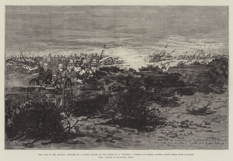 A Guerra no Sudão, Repulsa de um Ataque Noturno do Inimigo em uma Sereeba, formada por Mimosa Bushes, a oito quilômetros de Souakim(The War in the Soudan, Repulse of a Night Attack of the Enemy in a Sereeba, formed of Mimosa Bushes, Eight Miles from Souakim )Melton Prior |