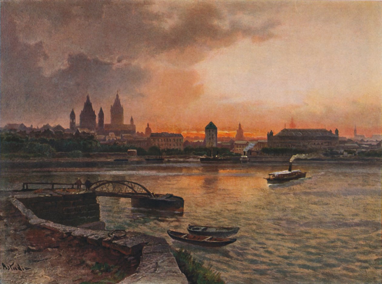 transporte · transporte · exterior · ao ar livre · germany · cidade · skyline · edifícios · povos · religioso · barco · barcos · alemão · artes · pintura · país · religião · noite · livro · dusk · vista · geografia · catedral · igreja · rhine · christianity · balsa · posição · rhineland palatinate · século · enfileirando o barco · vista · literatura · mainz · rio rhine · romanesque · twenties · hora · rhineland-rhineland-palatinate · transporte da água · povos do fundo · 1920s · 20o século · landscape · mayence · bilder vom rhein · nikolai of astudin · astudin · nikolai of · nikolai von astudin · hoursch bechstedt · bechstedt · hoursch · The Print Collector/Heritage Images |