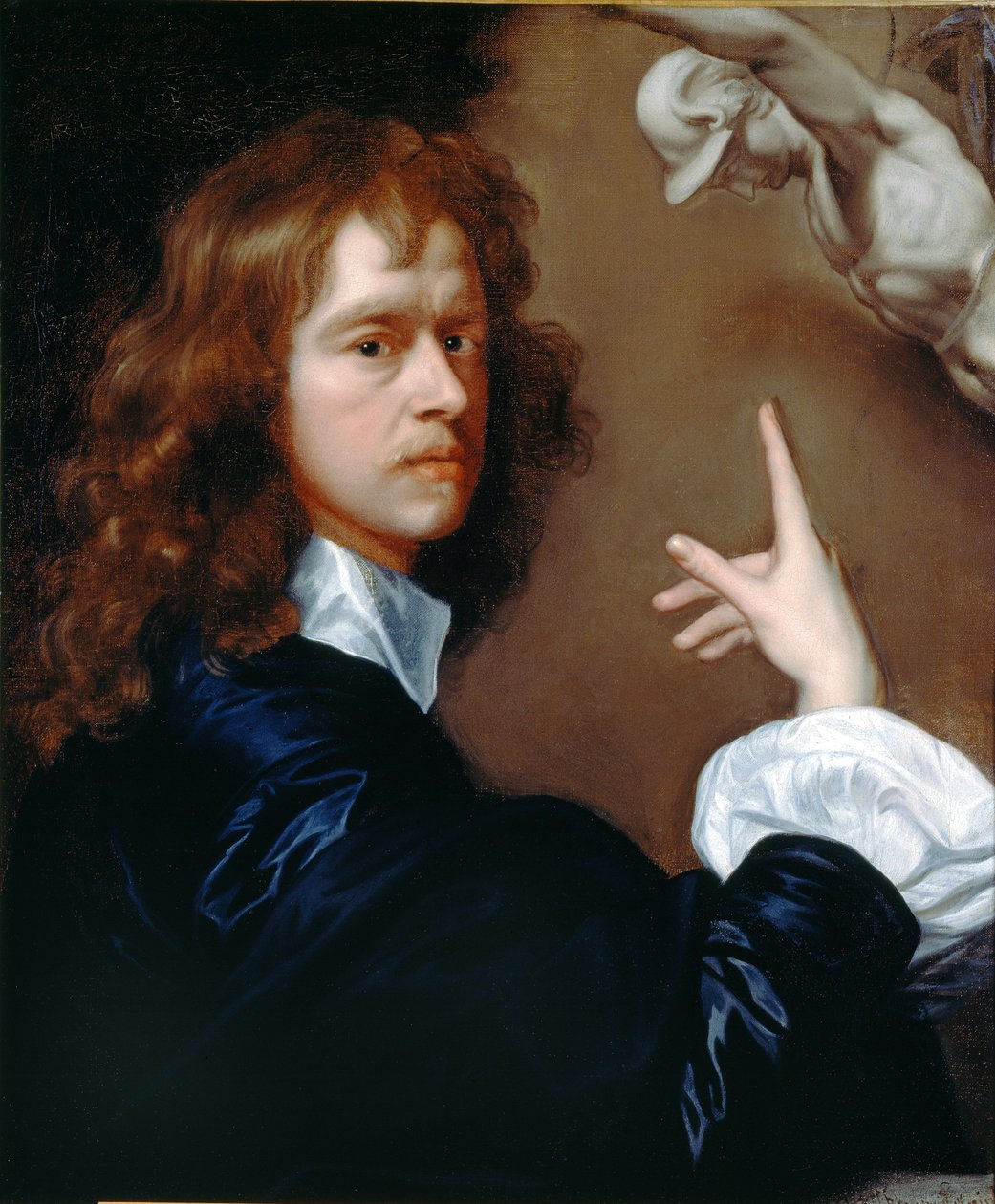povos · preto · macho · interior · dentro · homem · homens · mão · artes · corpo · branco · sculpture · arte · apontar · roupa · britânico · vestido · artista · século · gesticular · grâ bretanha · para dentro · luvas · revestimento · luva · roupa · uma pessoa · gesto da mão · redhead · cuffs · 17o século · direct gaze · portrait · robert walker · human likeness · walker · robert · black colour · ashmolean museum · Ashmolean Museum, University of Oxford/Heritage Images |