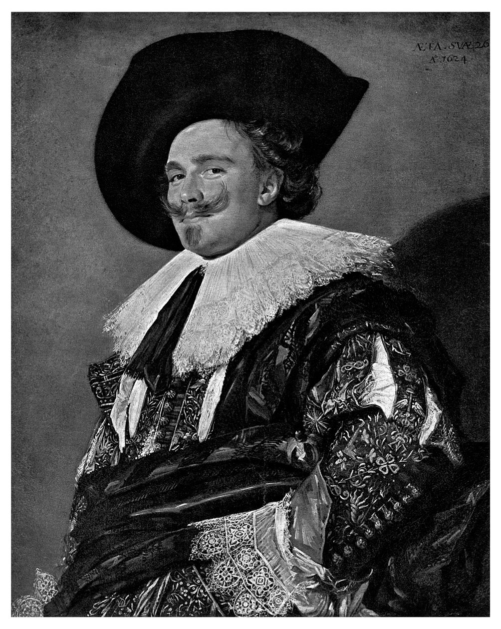 sorrir · povos · macho · cara · homem · homens · chapéu · artes · pintura · país · corpo · arte · traje · roupa · holland · holandês · vestido · guerra · posição · século · colar · moustache · laughter · soldados · soldado · conceito · laço · monocromÁtico · 17o século · preto branco · preto e branco · cavalier · the laughing cavalier · portrait · unknown · frans hals · hals · frans · The Print Collector/Heritage Images |