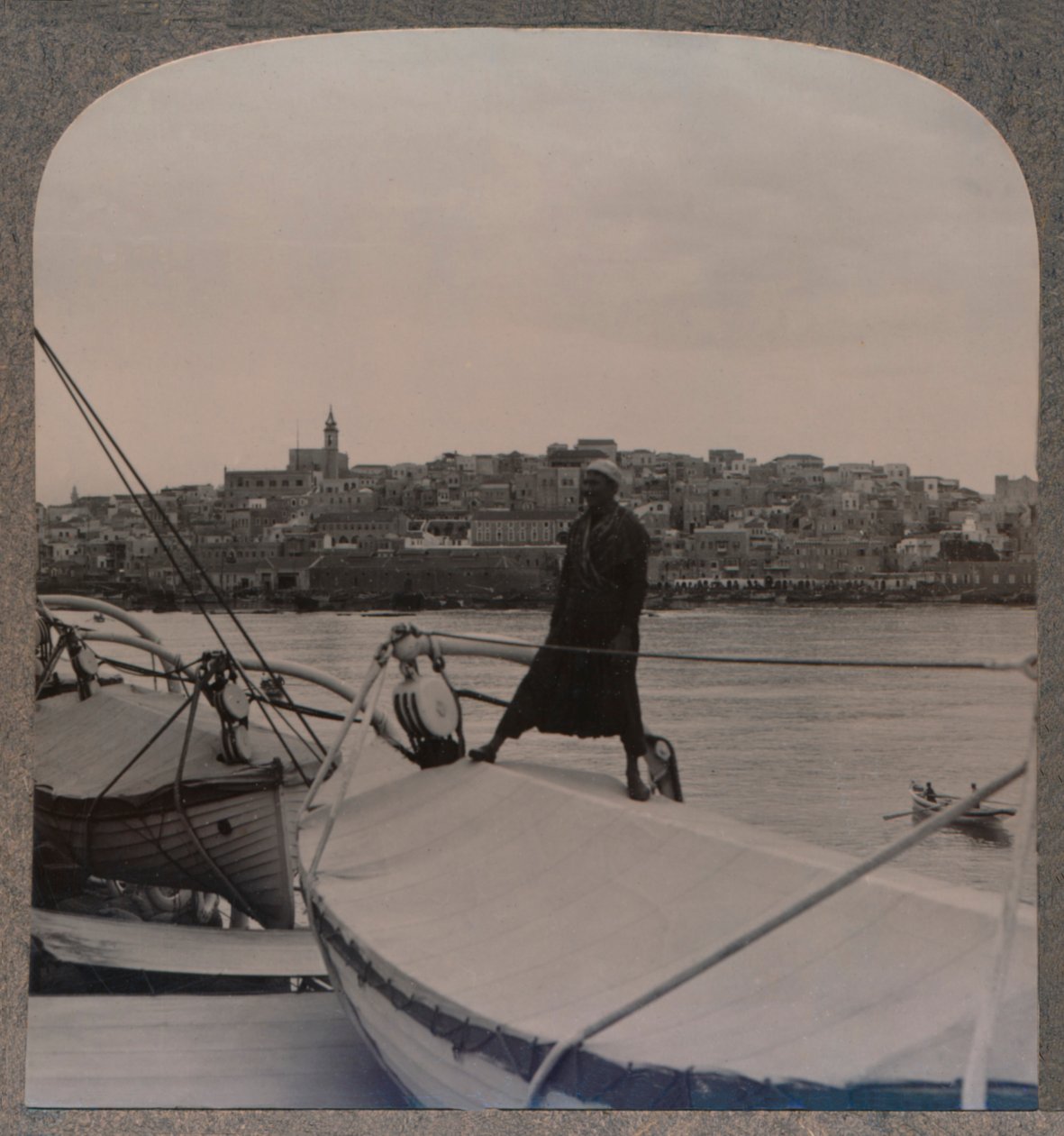 curso · transporte · transporte · cidade · povos · macho · homem · homens · barco · barcos · país · vista · antigo · posição · século · vista · jaffa · uma pessoa · atração tourist · monocromÁtico · publicação · palestina · transporte da água · preto branco · preto e branco · povos locais · 1900s · 20o século · publishers · tourism · photograph · stereocard · unknown · journey in all lands · realistic travels · stereocard · realistic travels publishers · The Print Collector/Heritage Images |