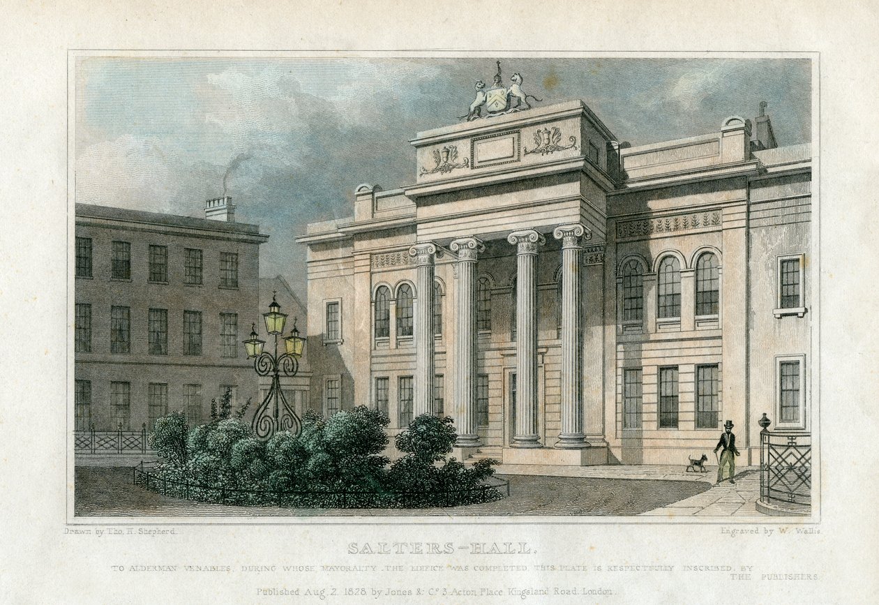 exterior · estrada · edifício · edifícios · inglaterra · arquitetura · país · comércio · britânico · inglês · pista · avenida · posição · século · cidade de londres · grâ bretanha · fora · guild · portico · característica architectural · 1ø século · décimo nono século · salters hall · engraving · thomas hosmer shepherd · shepherd · thomas hosmer · th shepherd · w wallis · wallis · w · The Print Collector/Heritage Images