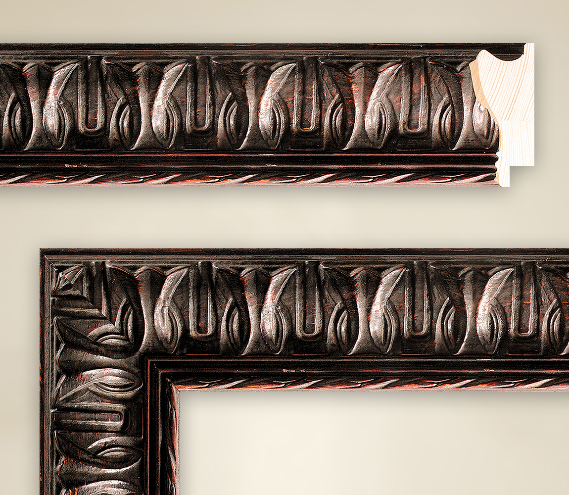 | Uma excelente moldura decorativa no verdadeiro sentido da palavra - em termos de dimensões, estatura e caráter: Stefanie convence com sua forma e cor. Quatro níveis diferentes de estrutura são incorporados em uma largura de 58 mm. Uma faixa fina e lisa que forma o final da parede abre caminho para a enorme parte interna. Aqui, por sua vez, os elementos de design na forma de esculturas generosas não eram enganosos. A borda desta barra empurra minimamente para dentro da sala, a fim de apresentar as fileiras de ornamentos em uma fileira. A constante alternância desses elementos decorativos garante uma combinação harmoniosa na visão geral, o que enfatiza a sensação de Stefanie. Após uma barra dupla subsequente em uma variante delicada e simples, uma série de ornamentos é usada novamente. A barra de madeira que aponta para o interior da imagem também possui uma estrutura adicional - elementos ondulados de estilo horizontal e ondulado foram escolhidos aqui para colocar o movimento em ação novamente. Um marrom muito escuro, quase lembrando um preto, está espalhado por toda a moldura da pintura. Uma sugestão de caráter colonial está oculta no esquema de cores, que cria detalhes em laranja acastanhado como uma ligeira abrasão nas cores. |